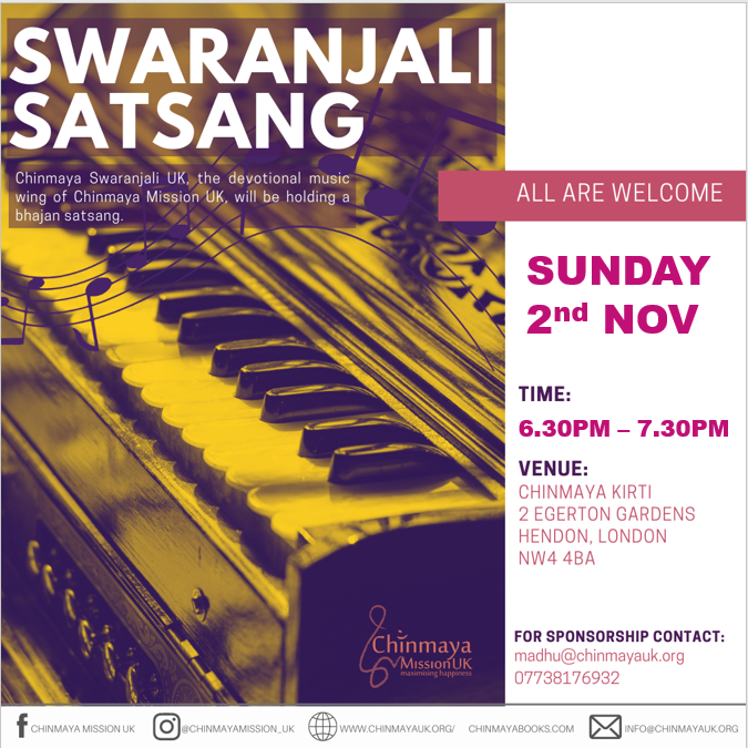 Chinmaya Kirti, 2 Egerton Gardens, Hendon, London NW4 4BA Chinmaya Kirti, 2 Egerton Gardens, Hendon, London, Hendon, United KingdomChinmaya Swaranjali UK, the devotional music wing of Chinmaya Mission UK, will be holding a bhajan satsang on Sunday 5th October 2025 from 6:30pm to 7:30pm. […]
